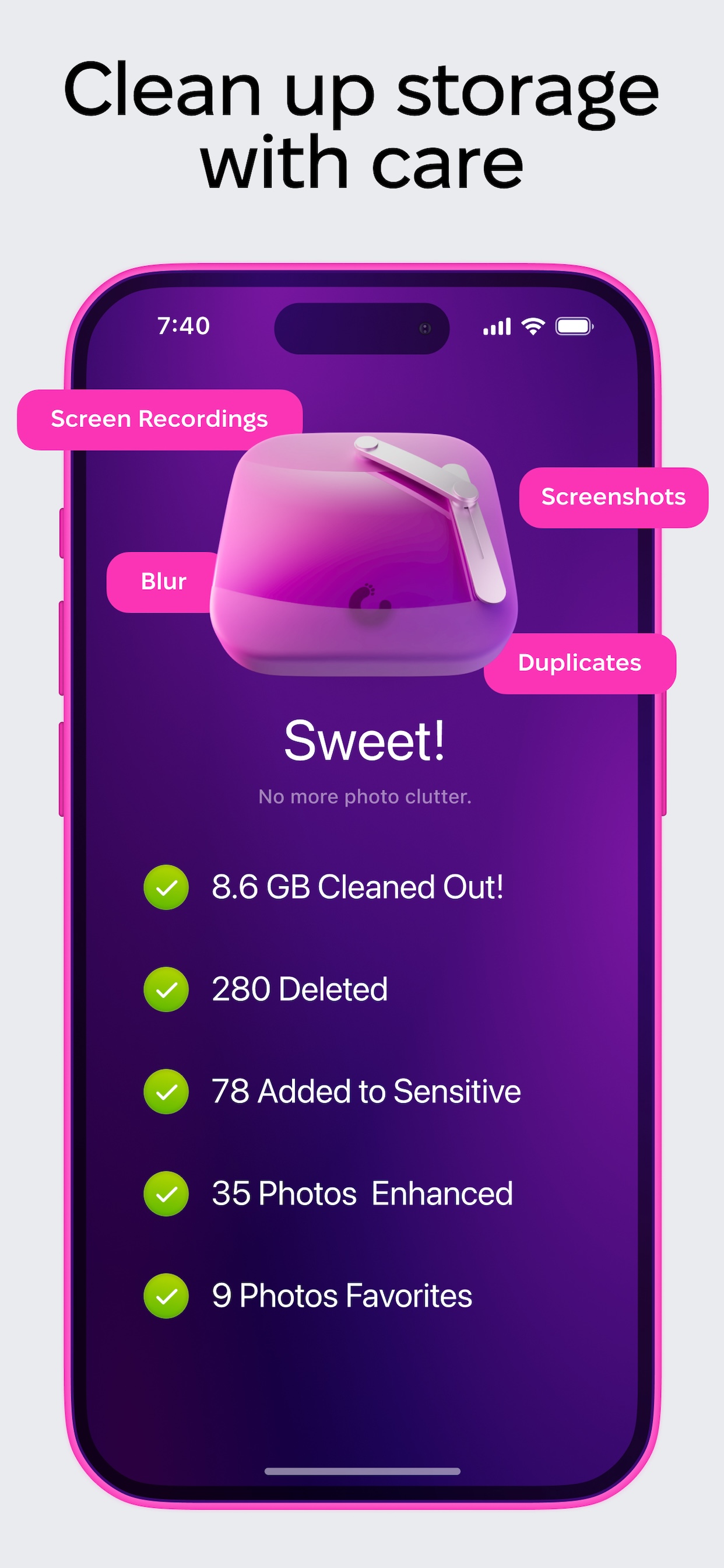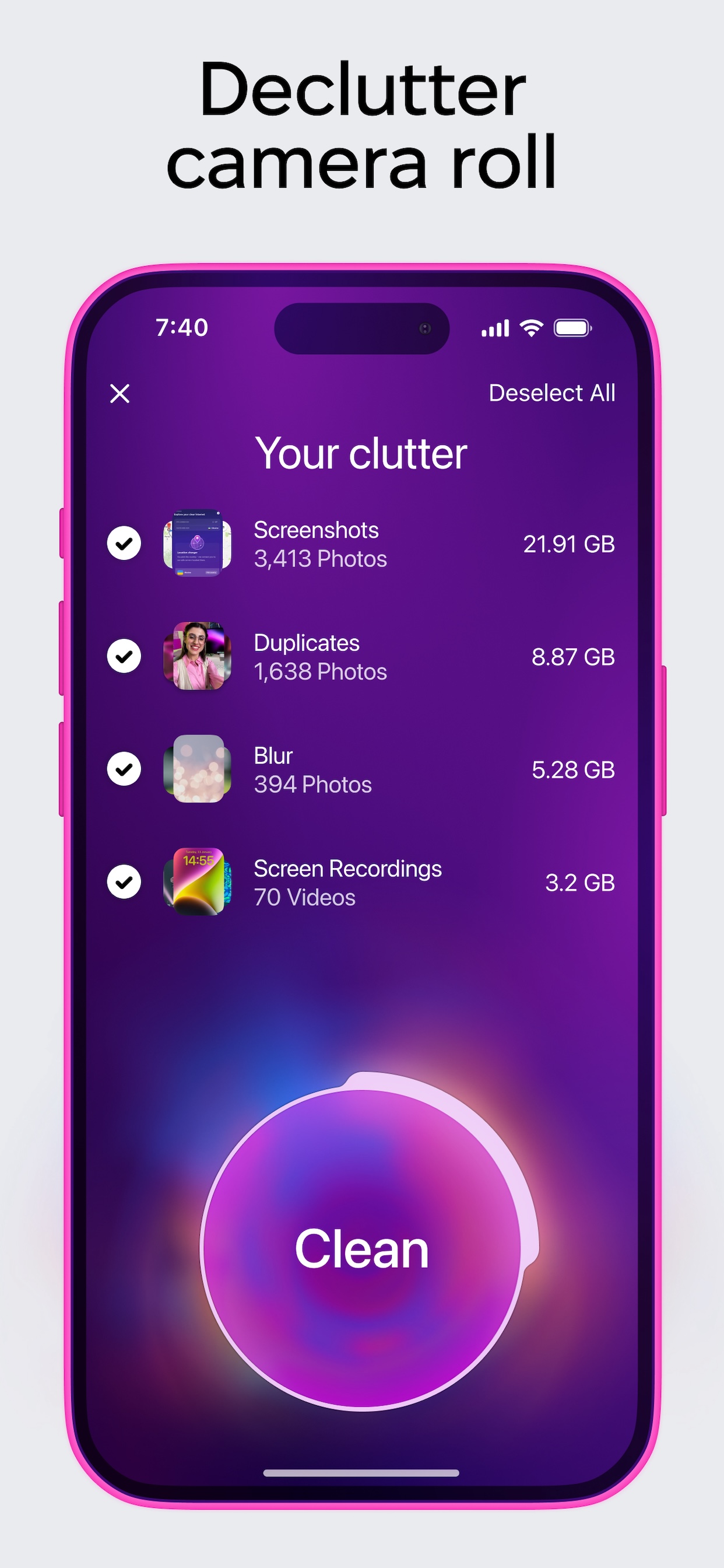 Tap the Declutter button to run a scan of your iPhone or iPad gallery and find items to remove — from blurred shots to screenshots, you can free up gigabytes of space in just a few taps. And not to worry, this careful cleaner allows you to review and edit what images are set to be deleted.