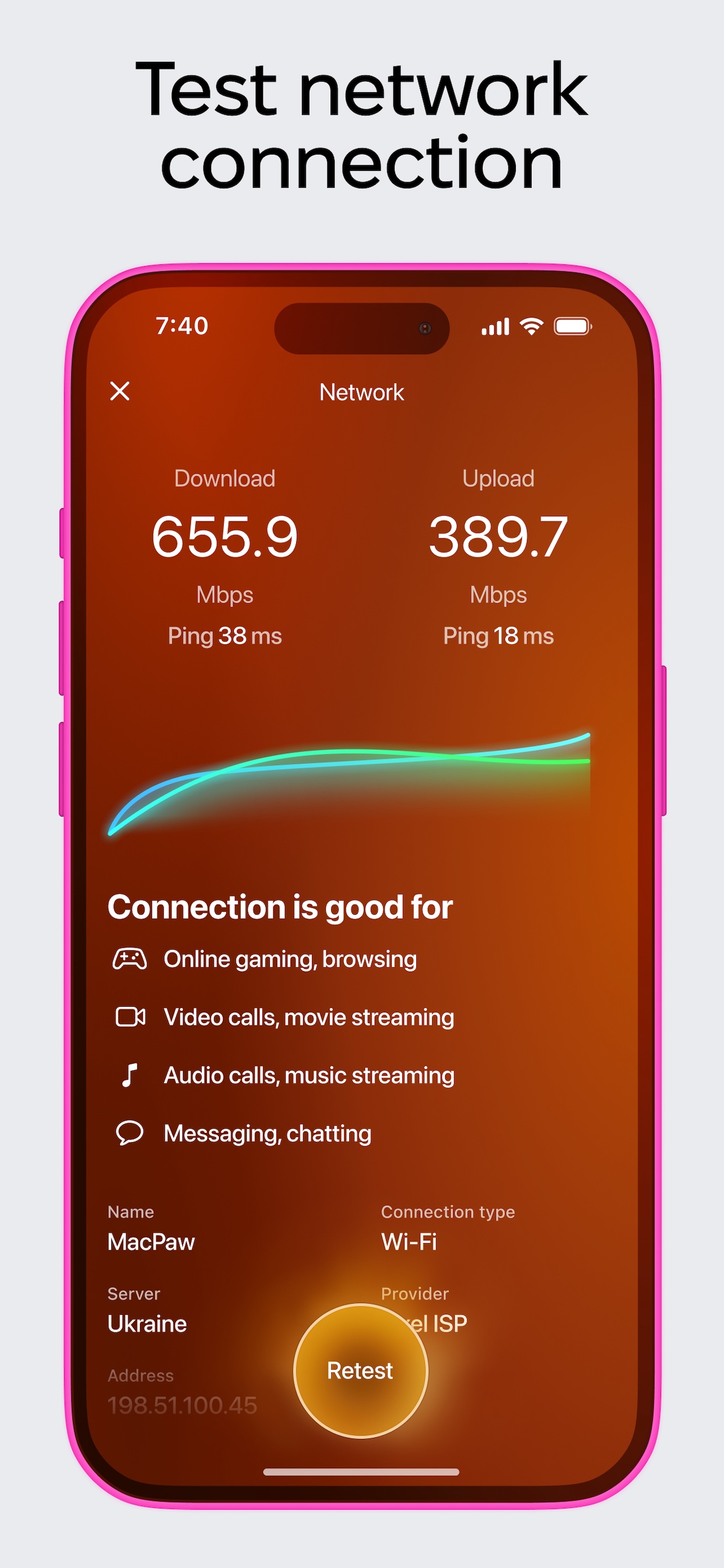 Test your network speed directly in CleanMy®Phone with the Network tool. Get a quick glance at your connection with information about your download/upload speed and ping time for both, IP address, connection type, and service provider displayed after the test.