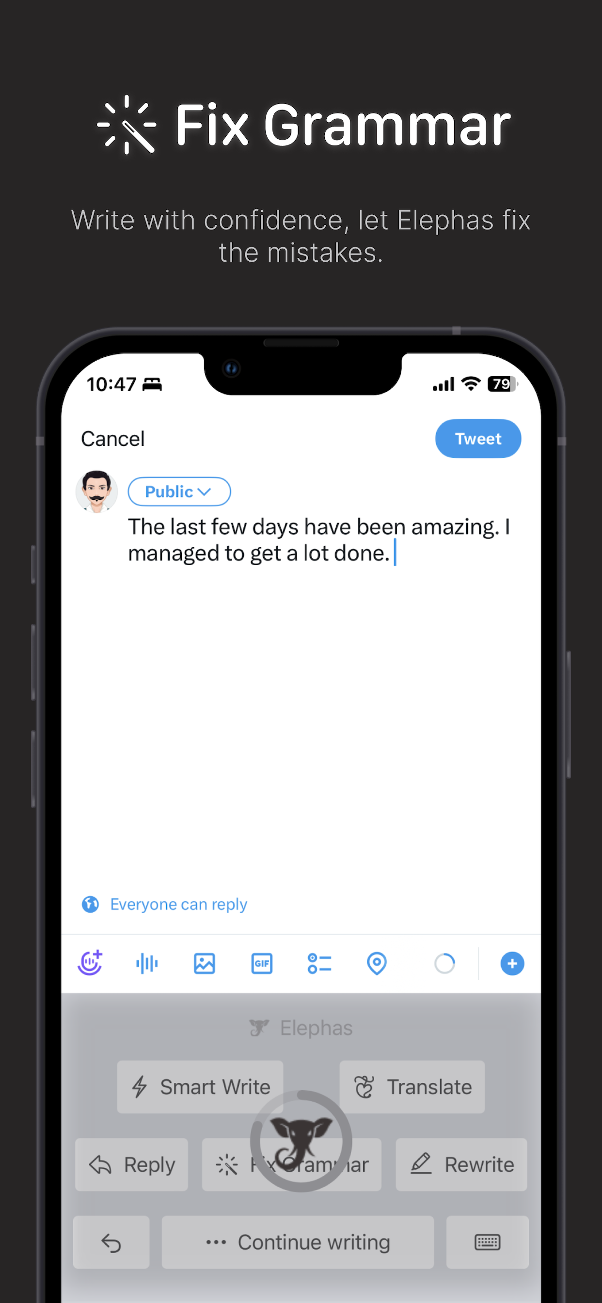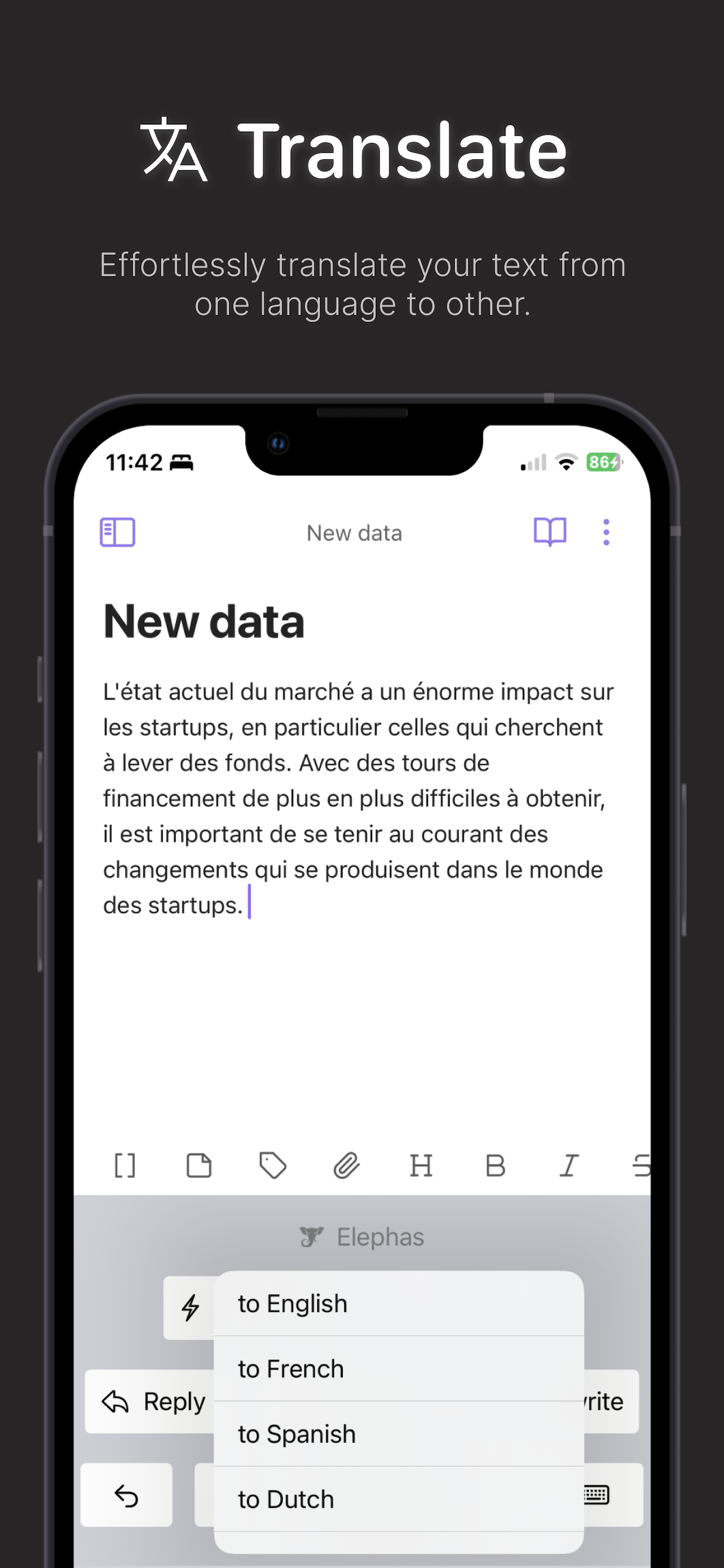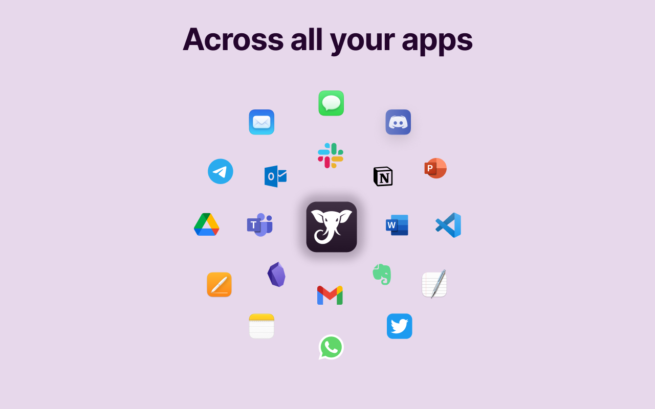 Writing emails, articles, and even work chat replies has never been easier! Elephas generates text for a wide variety of tasks and situations. It works across a number of popular applications, from Google Drive to Outlook to Notes and Gmail. Create emails, blog posts, presentations, social media posts, and more with Elephas.