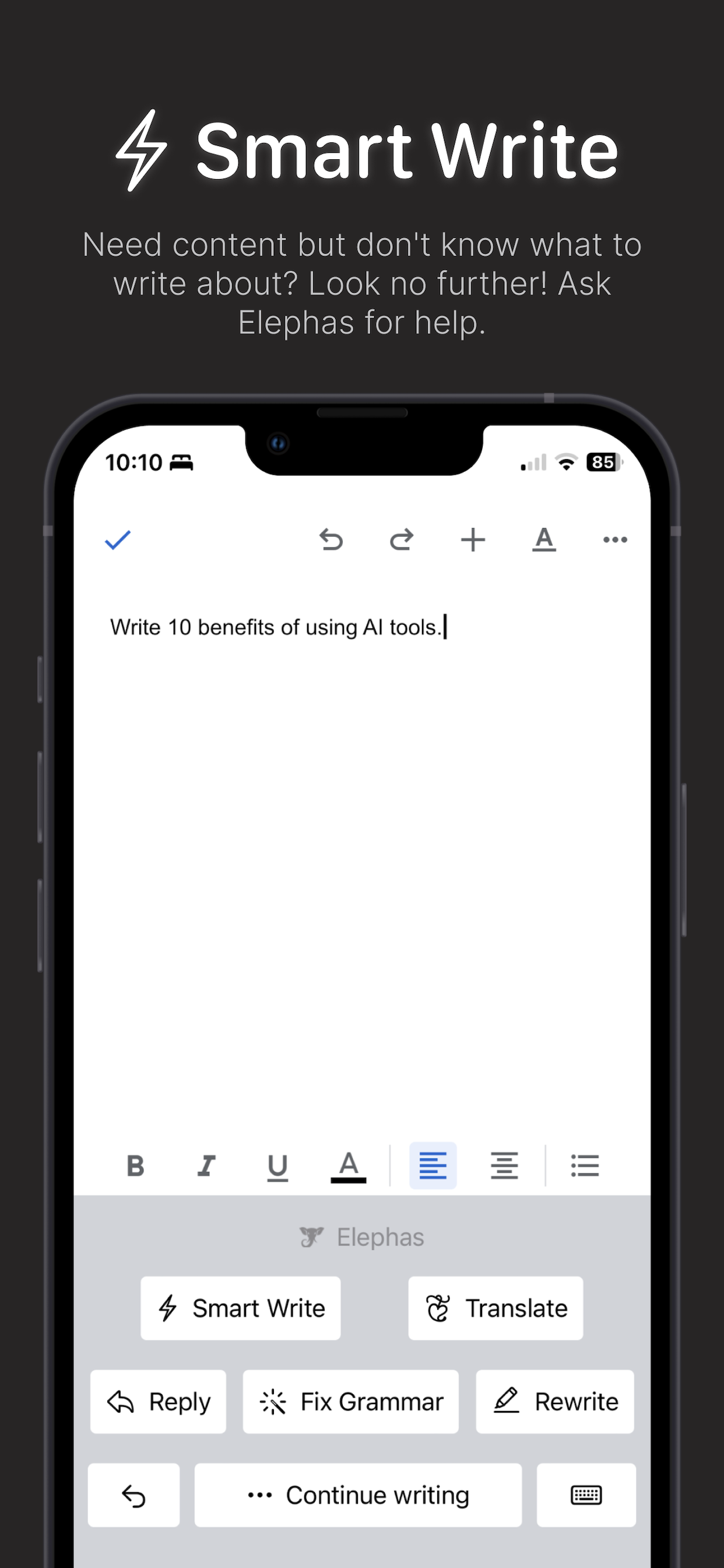 Got a huge amount of information to go over? Ask Elephas to summarize it for you. This AI writing assistant can also generate key points for your articles and presentations, provide ideas and catchy headlines, rewrite and proofread your text.