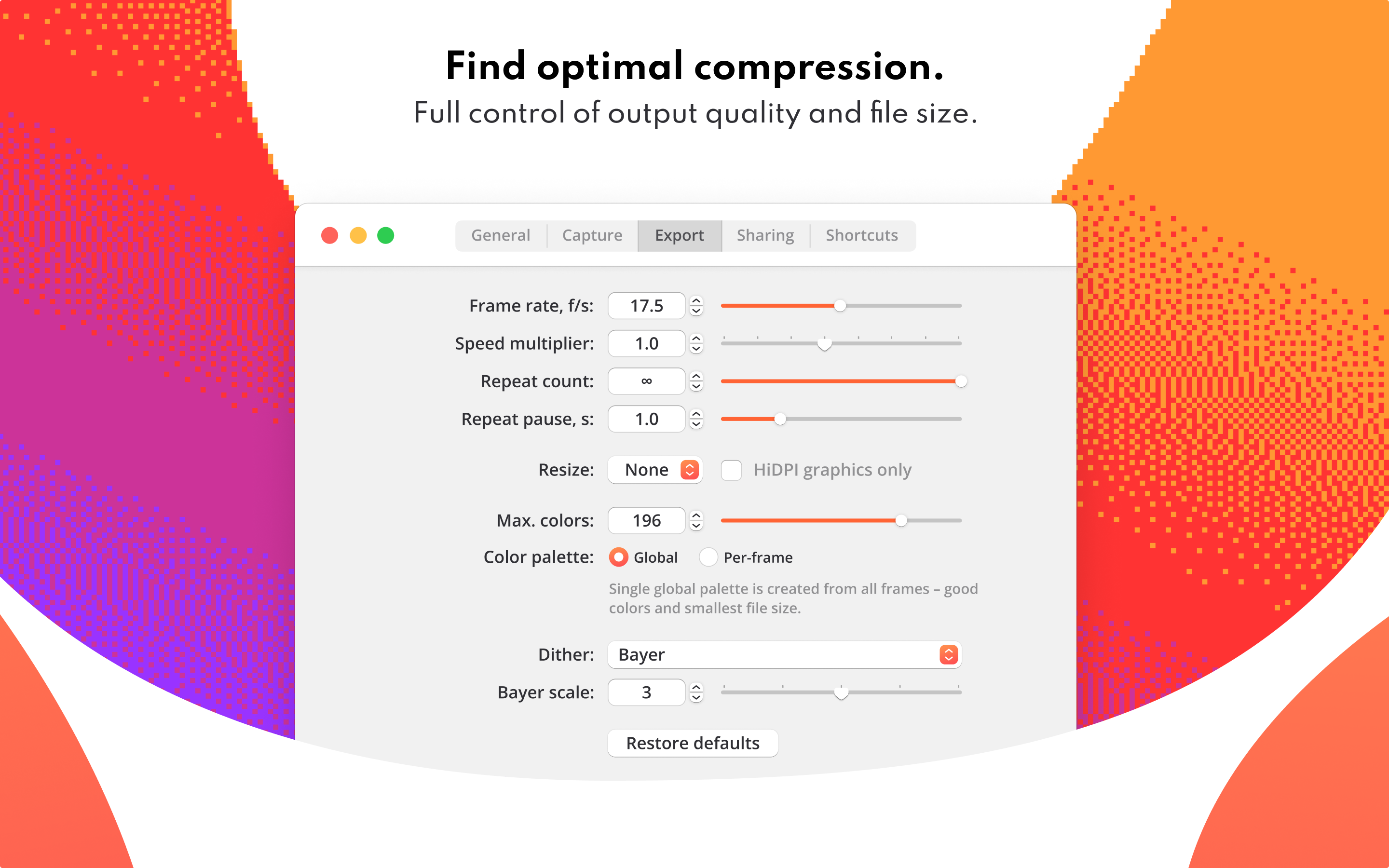 Використовуйте цю програму для запису екрана у форматі GIF, щоб будь-коли зробити скрінкаст у форматі GIF. І не забудьте скористатися розширеними параметрами стиснення. За допомогою Gifox ви налаштовуєте якість та розмір файлу вашої анімації. Просто перейдіть до Параметрів > Стиснення, щоб все правильно налаштувати.