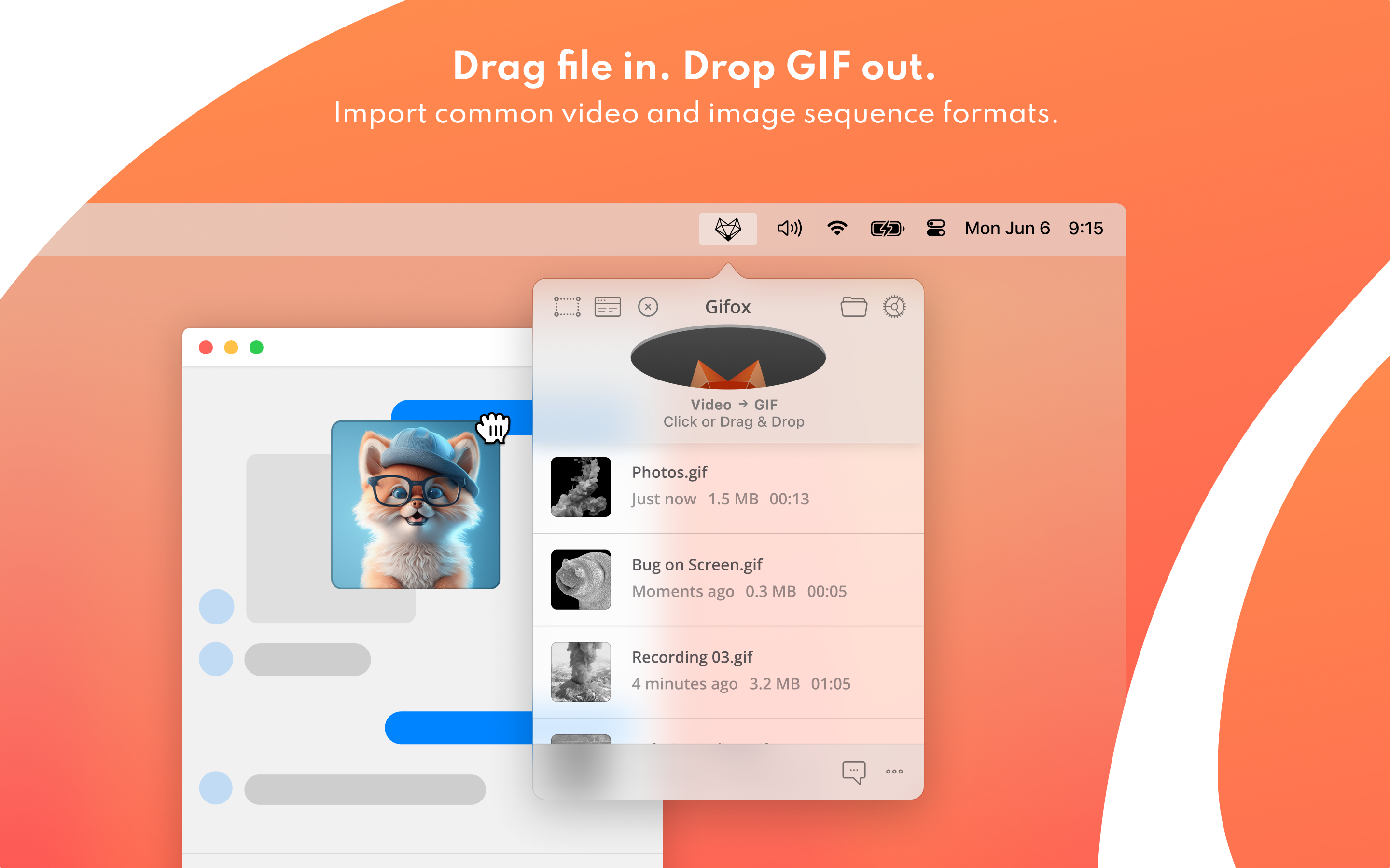 Підхоплюйте будь-які останні записи прямо з програми на смузі меню Mac. Перетягуйте свої GIF-файли куди завгодно або використовуйте прямі посилання, щоб ділитися своїми творіннями, не відволікаючись від роботи. Gifox пропонує максимальну гнучкість без шкоди вашому робочому процесу.