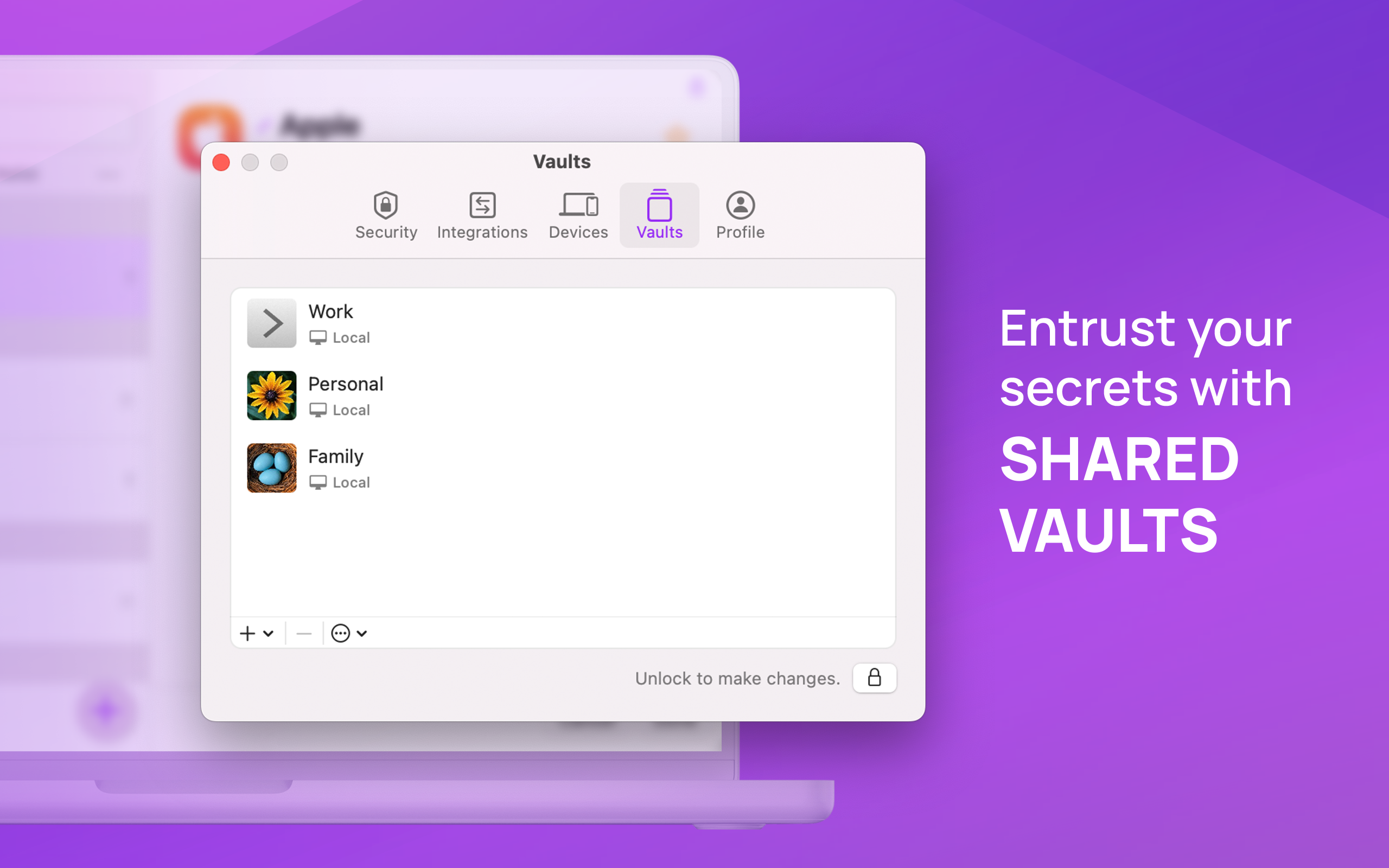 Легко діліться паролями з іншими за допомогою Shared Vaults. Створюйте та керуйте сховищами для полегшення керування паролями та діліться ними з іншими користувачами Secrets 4.
