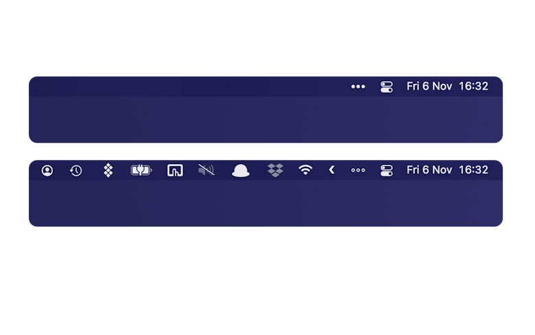 Set the order you like for your menu bar items as well as Bartender bar by simply pressing ⌘ and dragging the icons. Rearrange and hide apps on the fly for a minimalist and focused work environment.