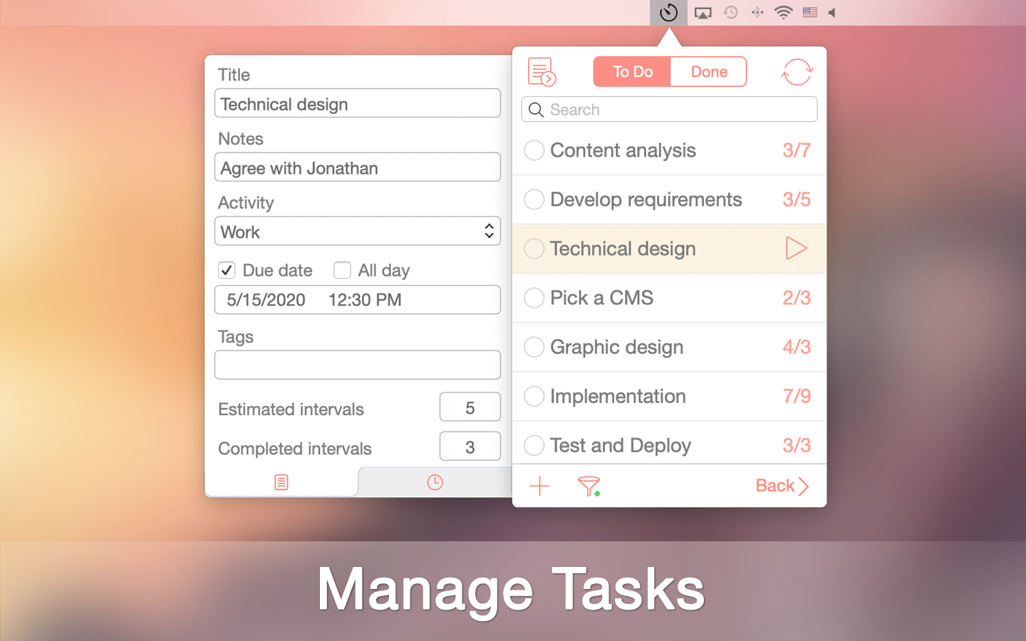 Визначайте час для роботи та концентруйтесь без відволікань. Встановлюйте кількість перерв між задачами та їх тривалість. Ще одна корисна річ, що відрізняє цю програму від інших планувальників задач – ви можете розпочинати, призупиняти або пропускати робочі інтервали.