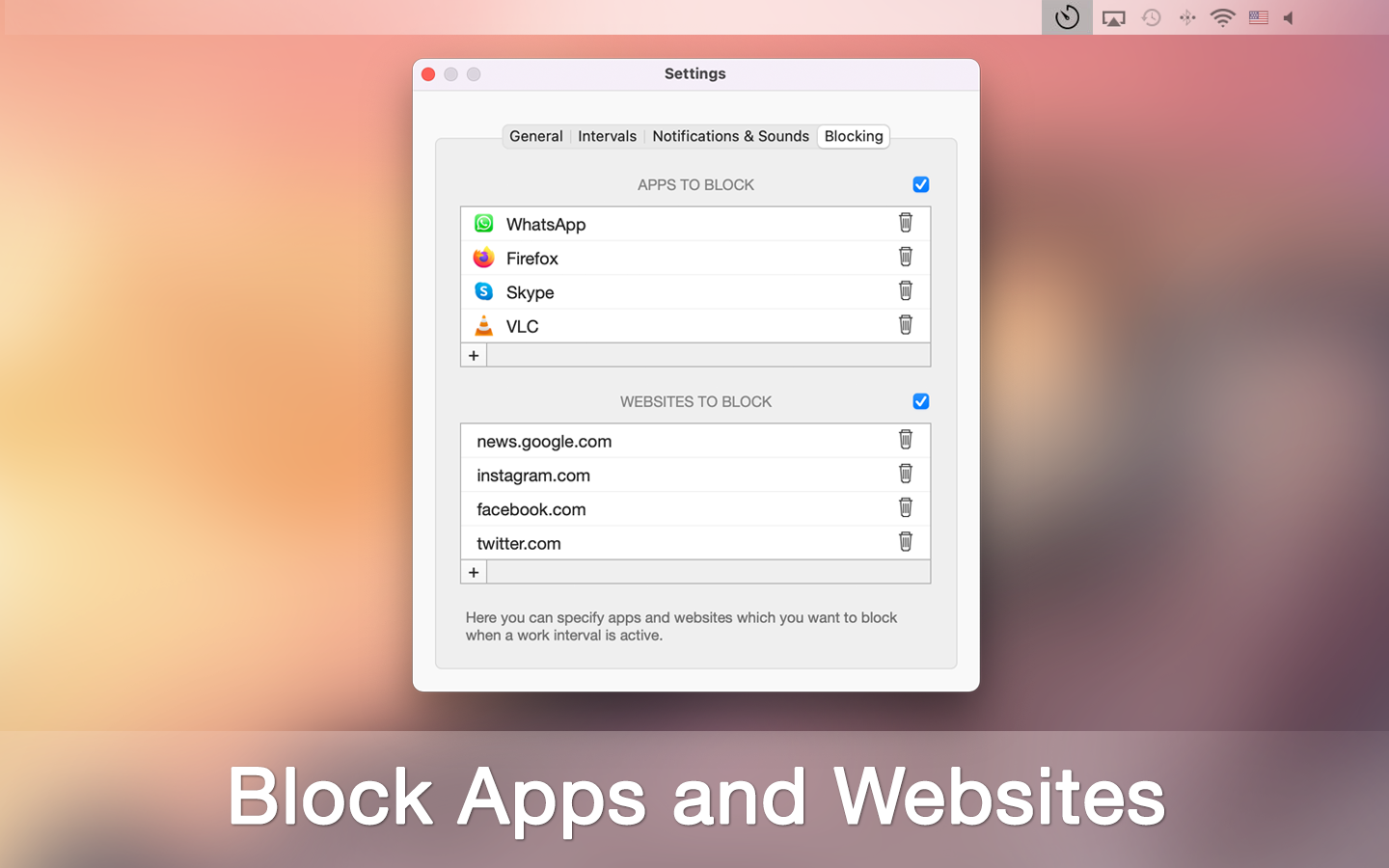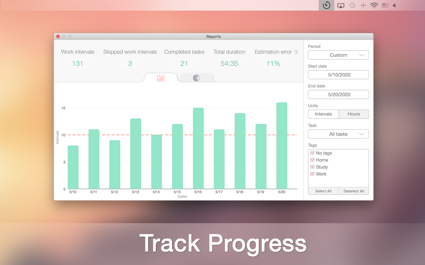 Підлаштуйте цей інструмент для максимально зручного для вас способу організовано вести щоденні задачі. Визначайте довжину інтервалів та їх кількість на день. Створюйте звичку бути продуктивними й вона супроводжуватиме вас і надалі.
