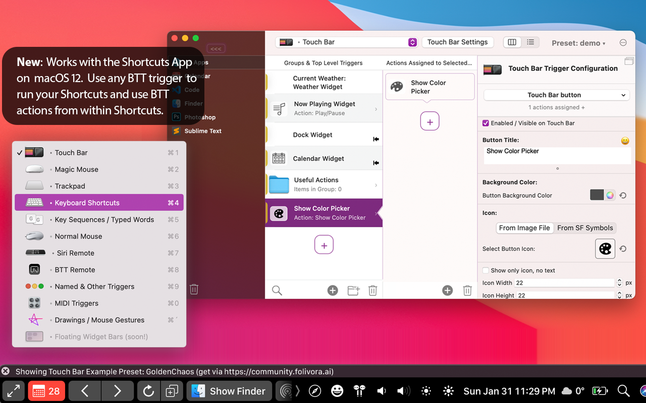 BetterTouchTool vous permet de ré-imaginer la Touch Bar de la façon que vous avez toujours souhaitée. De la modification de votre configuration existante à la création de nouveaux boutons fonctionnels et même le réglage de l’espacement entre ces éléments, votre Touch Bar pourra englober des déclencheurs uniques qui compléteront à merveille votre façon de travailler.