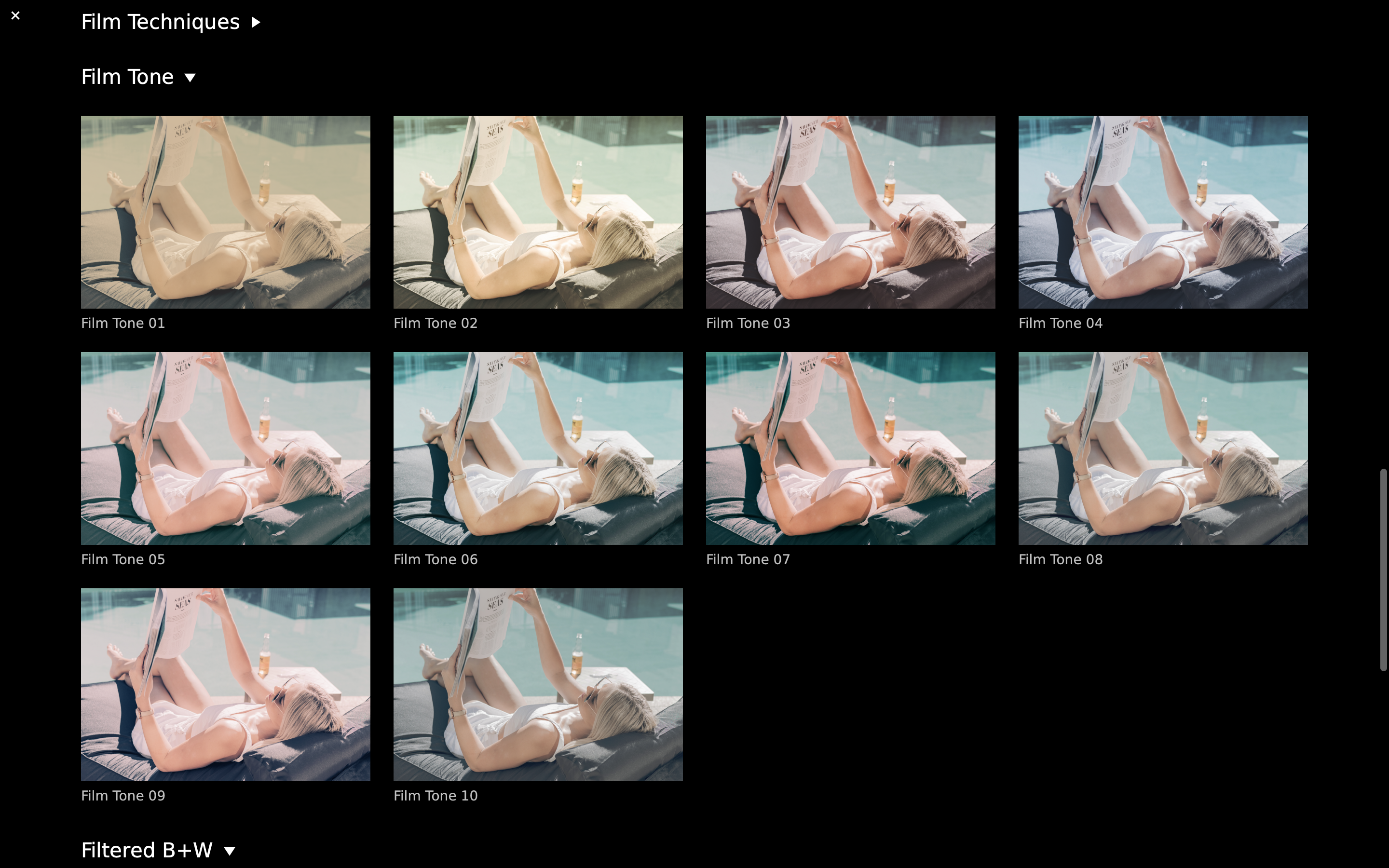 Embellissez vos photos et vidéos en un seul clic en utilisant une bibliothèque de plus de 200 filtres créés par des professionnels. CameraBag Pro n'utilise pas d'astuces simples comme la sursaturation. Au lieu de cela, chaque filtre a été soigneusement conçu par des photographes, vidéastes et designers pour assurer un résultat unique et magnifique. Les filtres comprennent le noir et blanc, la photographie classique, le mat, le vintage, le monocolore, la correction des couleurs, l'émulation d'objectif et plus encore.