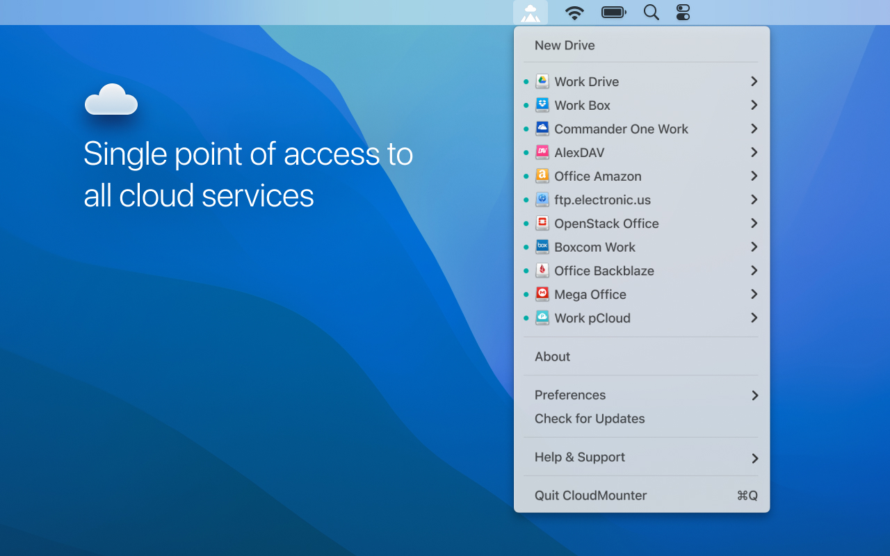 Accedi ai file presenti sui tuoi vari account di archiviazione cloud da un unico posto. Configura accessi e autorizzazione per ogni provider di archiviazione cloud direttamente dal menu di CloudMounter. L'app attualmente supporta: Dropbox, Google Drive, Microsoft OneDrive, Amazon S3 con endpoint server personalizzati, FTP/SFTP/FTPS, OpenStack Swift, Box, BackBlaze B2, WebDAV e altri ancora in futuro.