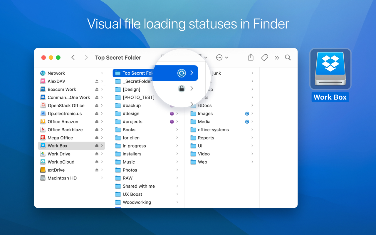 Ti basta uno sguardo per avere una panoramica di tutti i tuoi file. CloudMounter mostra l'avanzamento di trasferimenti, upload, spostamenti e aggiornamenti con icone dal design accattivante. Puoi anche spostare i file dalle piattaforme cloud direttamente al Finder e controllarne l'andamento nel caso proprio come per le attività eseguite con file locali.