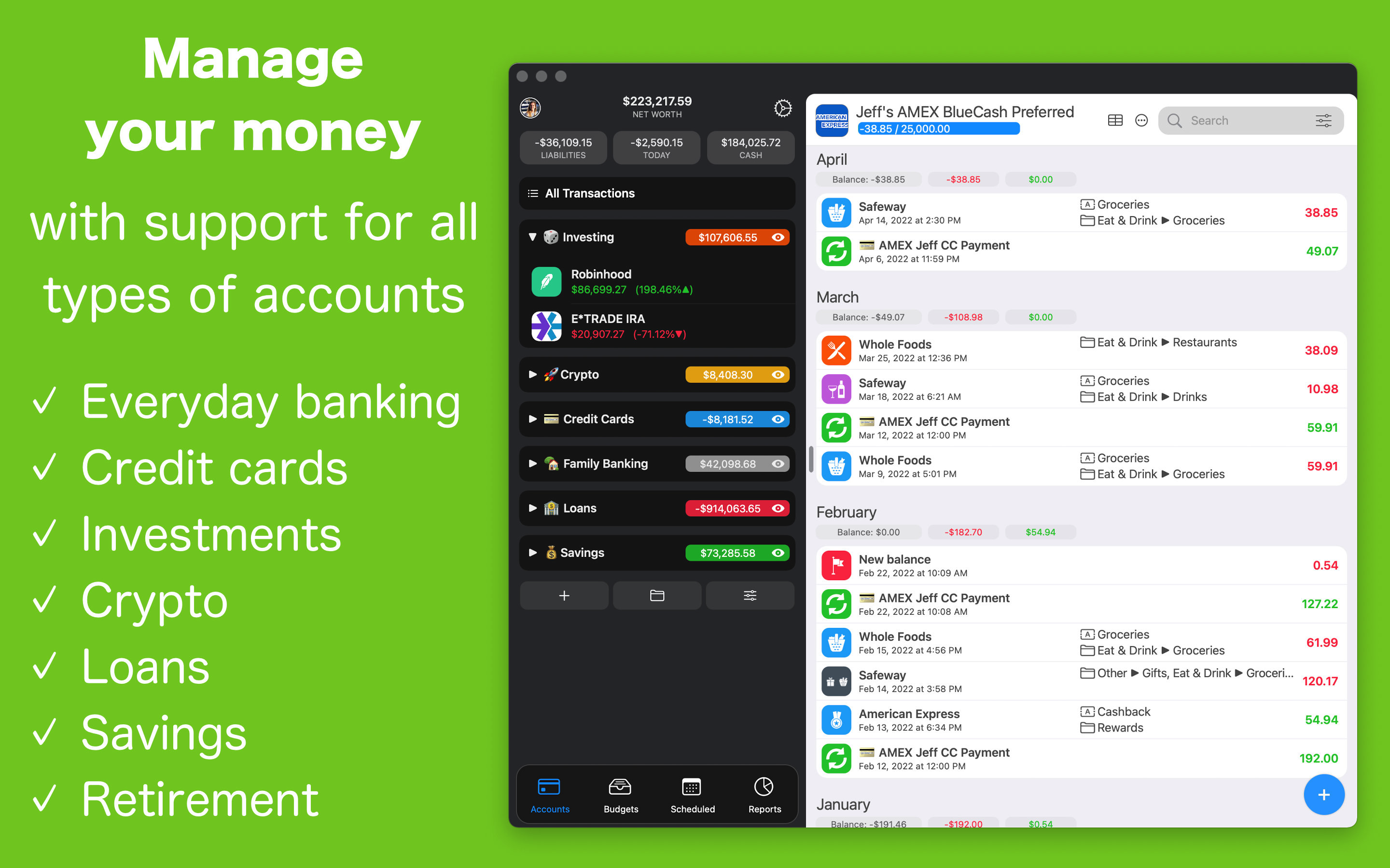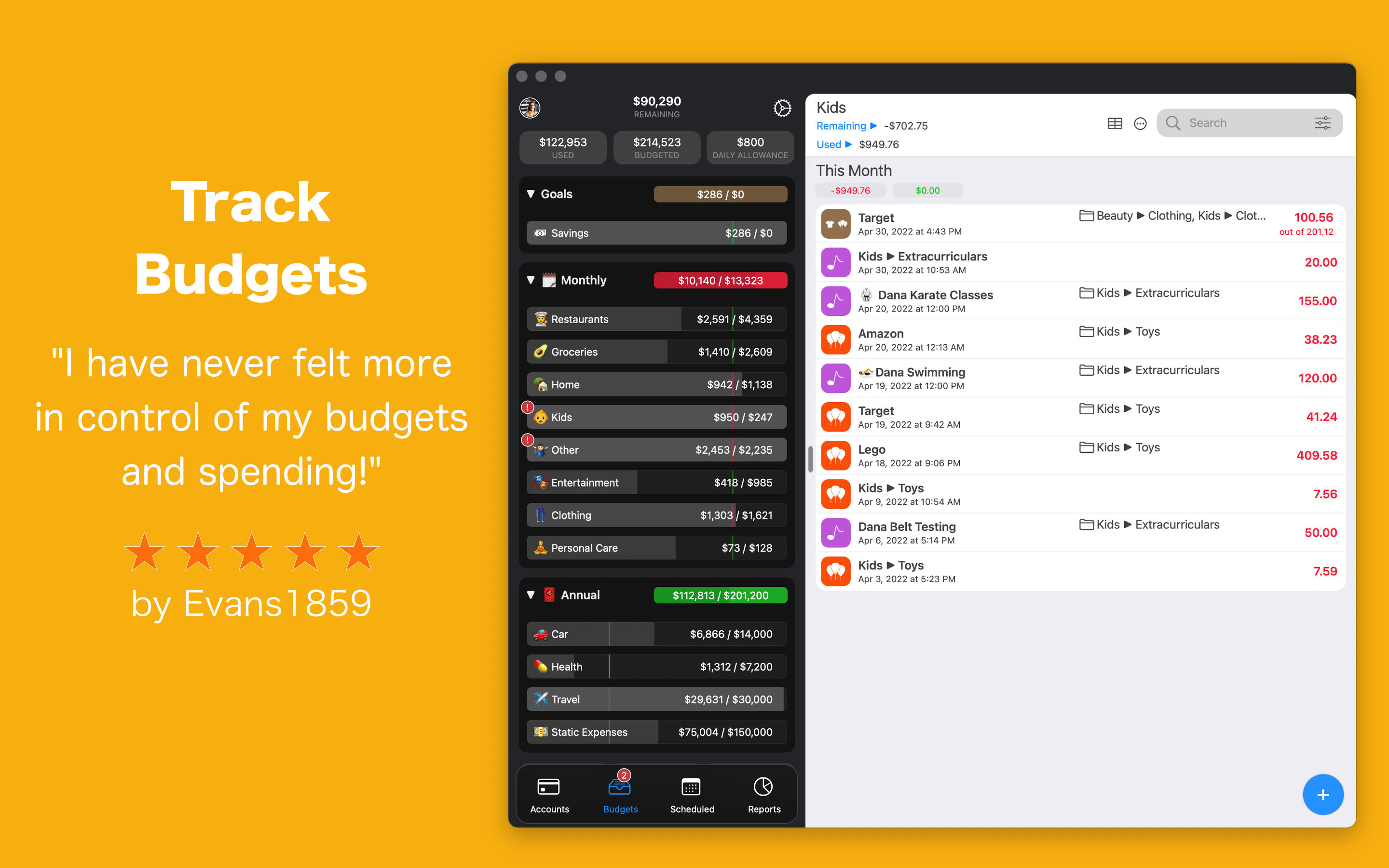 Registra le tue spese in MoneyWiz 2023 e monitora il tuo patrimonio netto, i saldi e le transazioni. Crea budget basati su entrate o spese per aiutarti a pianificare e gestire le tue finanze. Sposta denaro tra i budget per aggiustamenti semplici, visualizza l'avanzamento del budget e altro ancora.