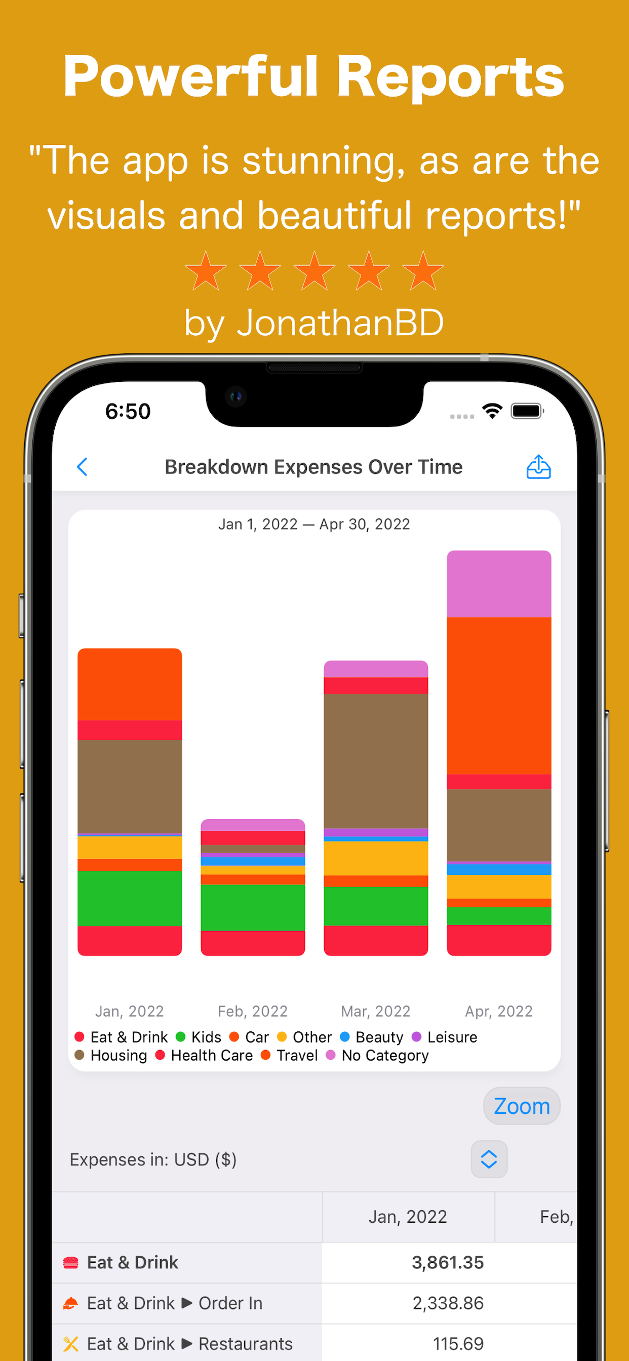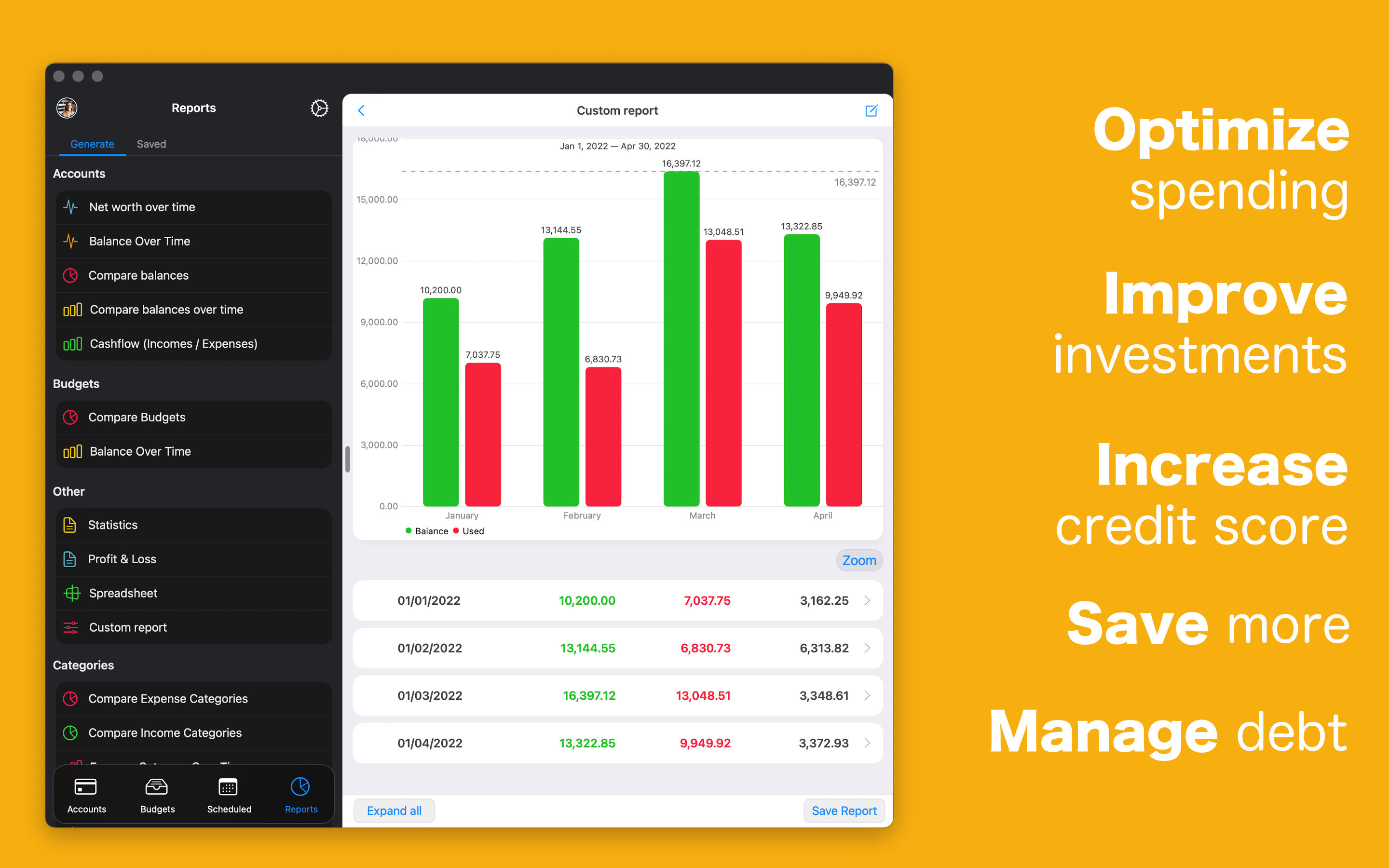 Il controllo delle entrate e delle uscite per un budgeting efficace funziona davvero solo se si esaminano regolarmente i risultati ottenuti. MoneyWiz 2023 offre più di 30 tipi di resoconto per analizzare le tue finanze. Studiali da solo o esportali come CSV o PDF per discuterne con il tuo consulente finanziario, commercialista o partner.