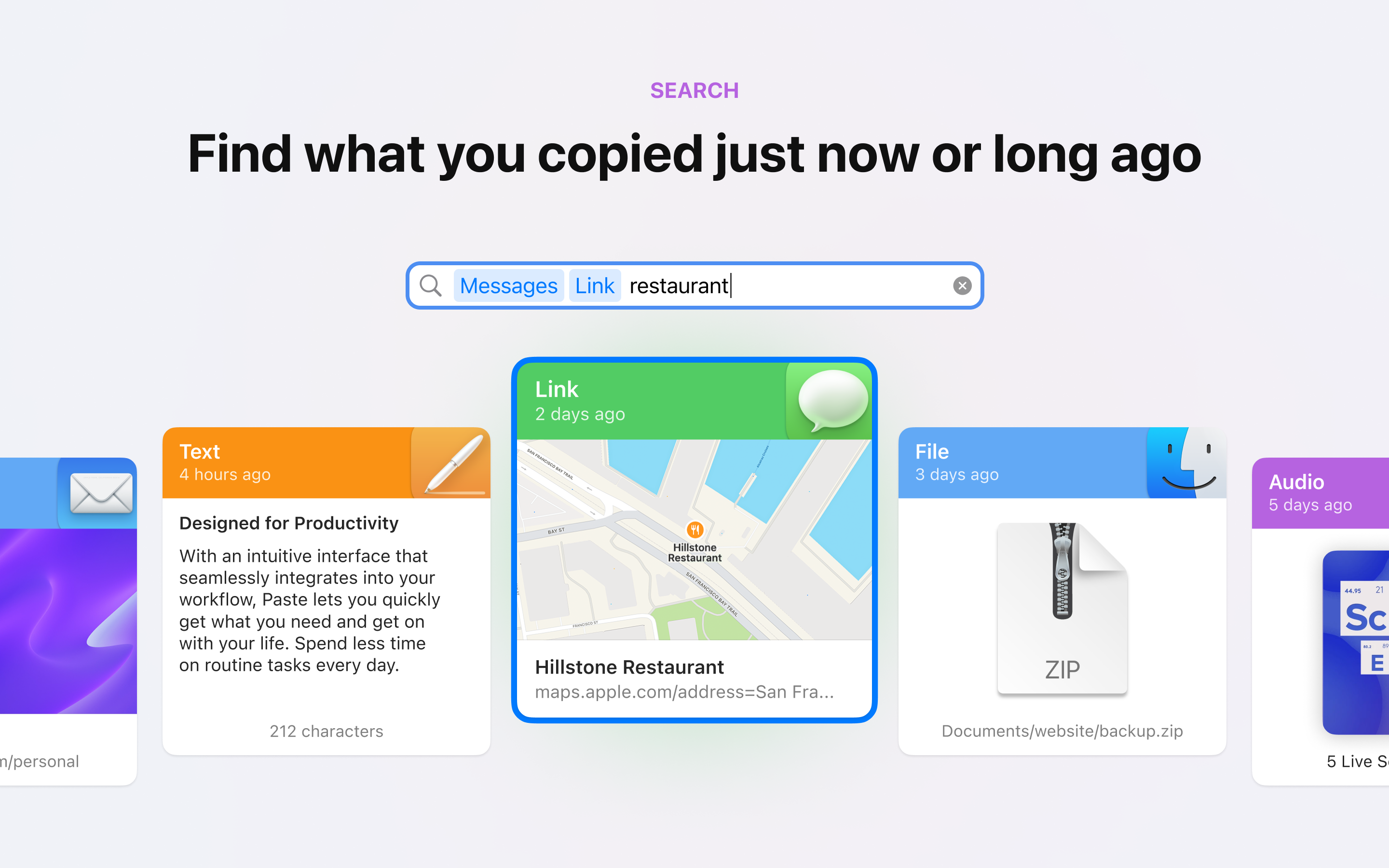 L'app ti consente di trovare rapidamente il frammento di testo che cerchi. Utilizza la ricerca intelligente per trovare in pochi secondi il contenuto copiato. È davvero facile e veloce: devi solo iniziare a digitare e Paste trova immediatamente quello che stai cercando.