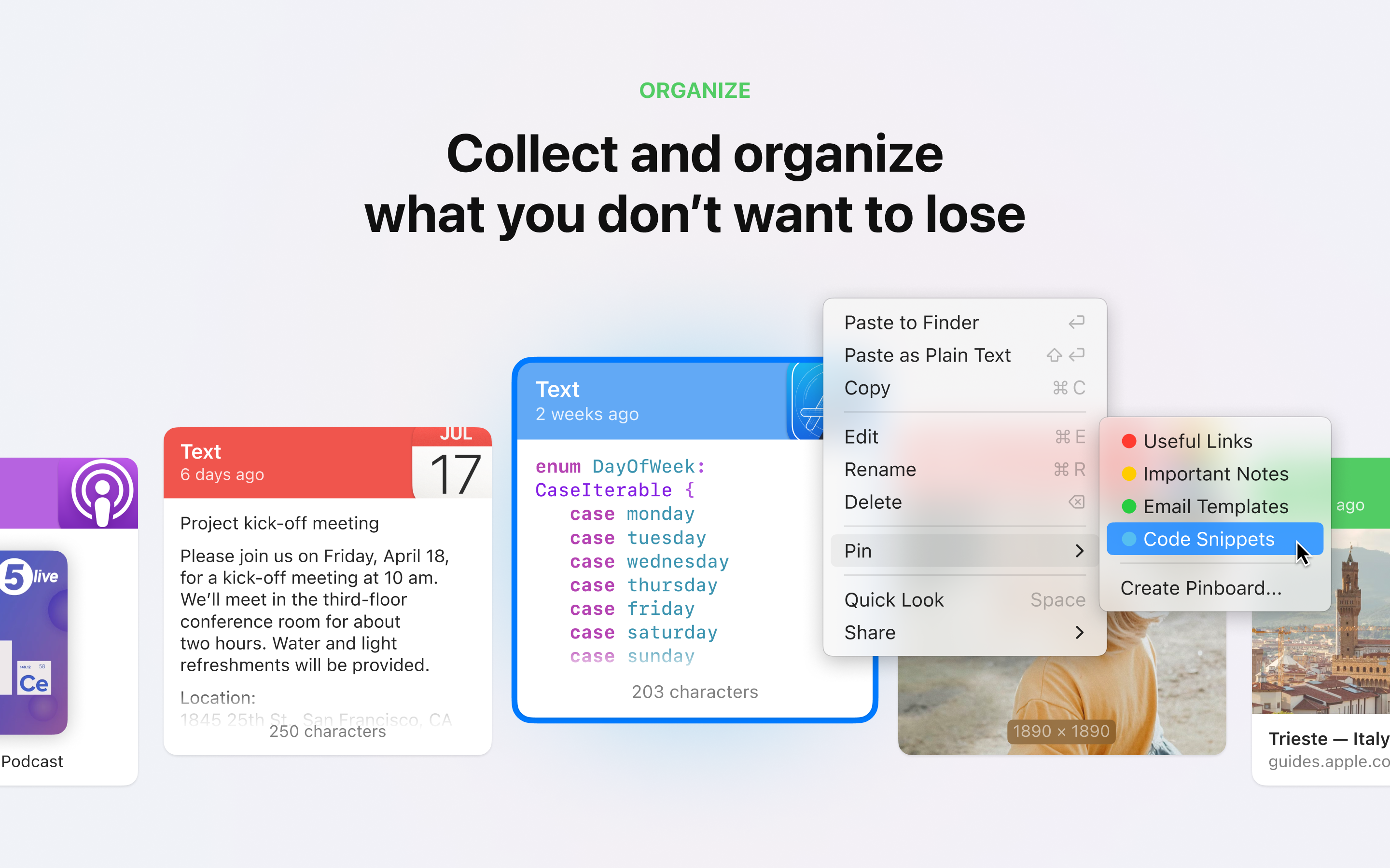 Copiare più elementi e poi incollare solo quelli desiderati sembra un sogno, vero? Con Paste puoi copiare e incollare più elementi alla volta con estrema facilità, tenere traccia di quelli copiati e incollati, oppure selezionare solo quelli che ti occorrono e trascinarli in qualsiasi posizione o app del Mac.
