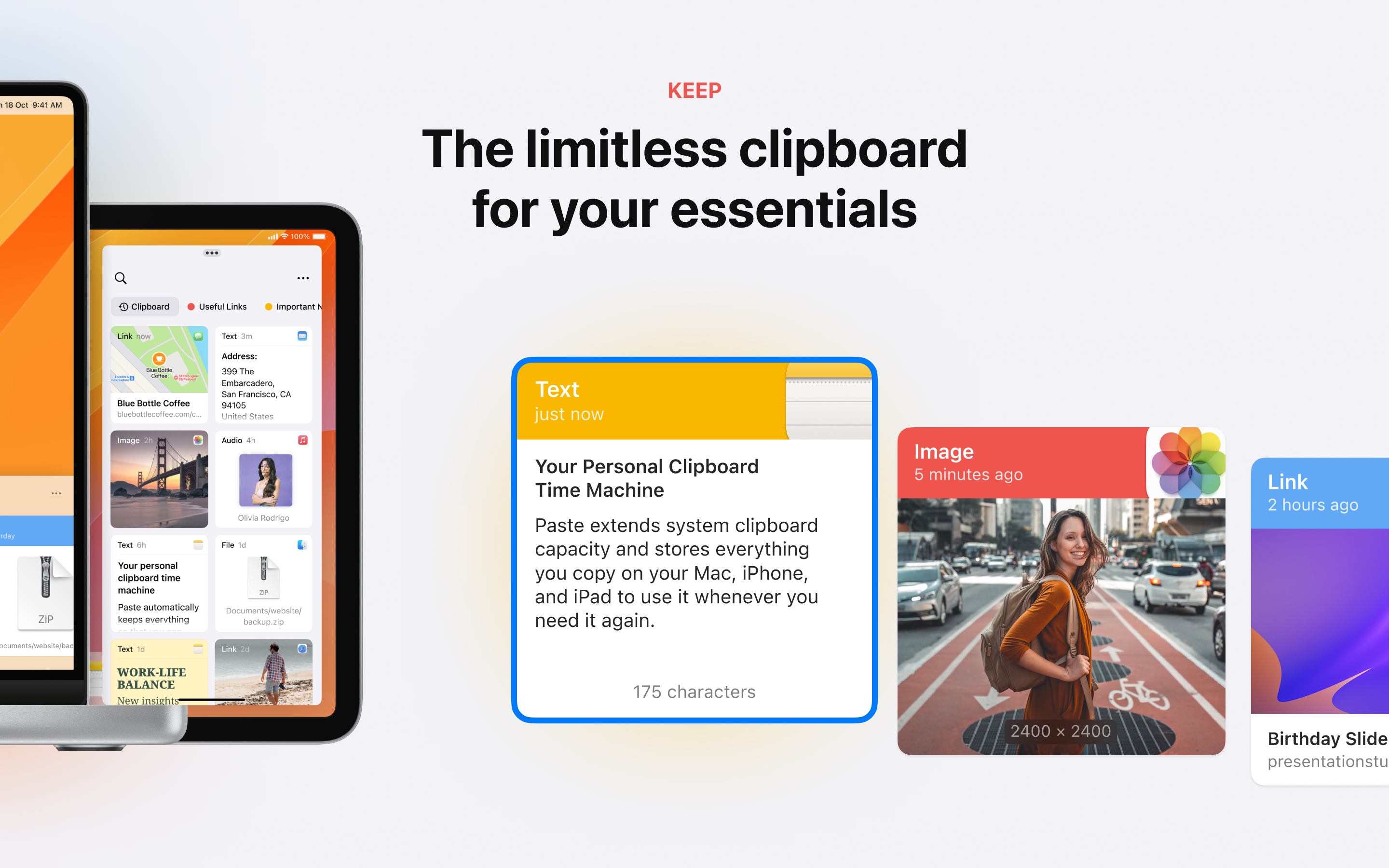 Mantieni al sicuro su iCloud la tua cronologia degli appunti e pinboard, così potrai accedervi da tutti i tuoi dispositivi. Goditi la comodità di avere i dati sincronizzati su tutti i tuoi dispositivi. Inutile aggiungere che Paste funziona perfettamente anche con gli appunti universali su tutti gli altri dispositivi.