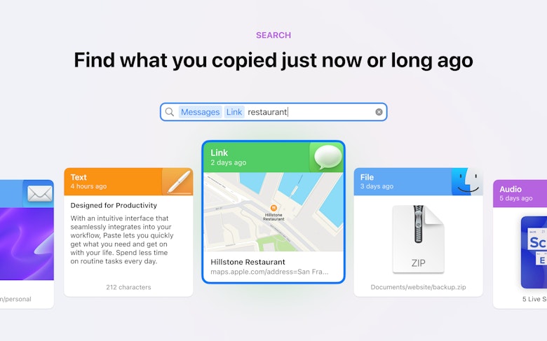 The app lets you quickly find that snippet of text you've been looking for. Use the intelligent search-as-you-type search to get the copied content you need within seconds. It’s really easy and fast. All you need to do is to begin typing and Paste will instantly deliver what you're looking for.