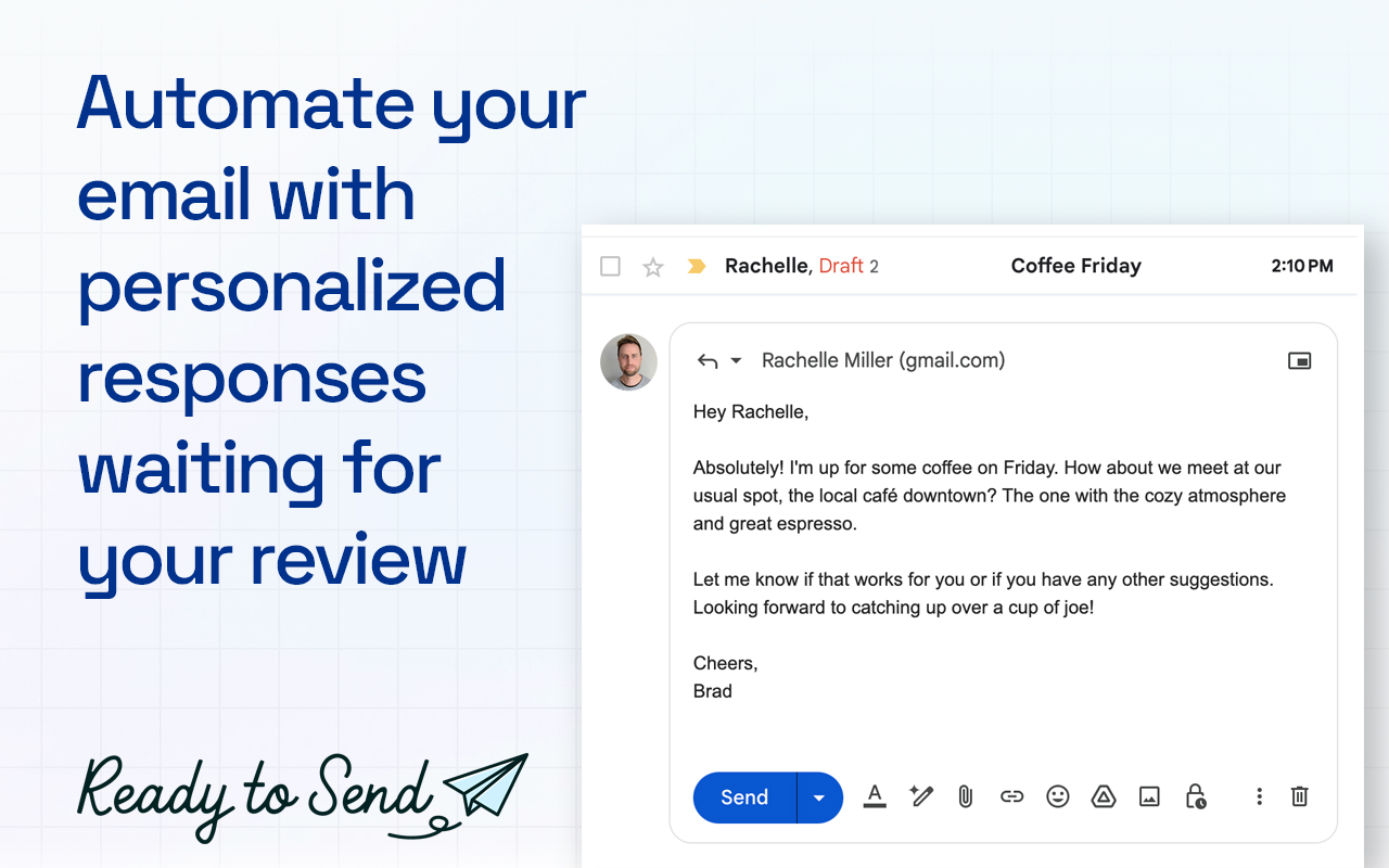 Ready to Send використовує штучний інтелект для створення чернеток для листів, на які потрібно відповісти. Коли ви відкриєте поштову скриньку, чернетки вже будуть там. Тож все, що вам потрібно зробити — це переглянути та надіслати.