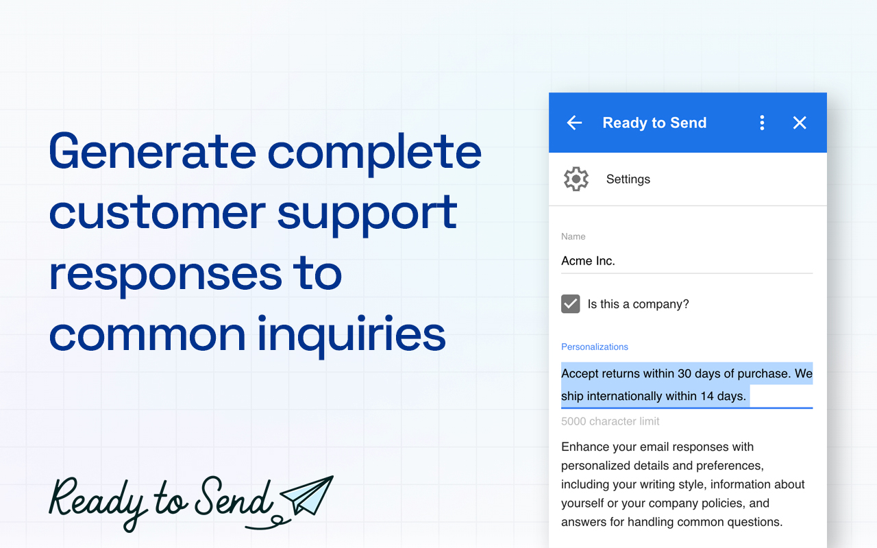 В Ready to Send ви можете описати свою компанію, стиль письма, звичайну довжину листа тощо, щоб допомогти йому створювати чернетки відповідей, які звучать так само, як ви. Скористайтеся опцією персоналізованих інструкцій у програмі, щоб все налаштувати.