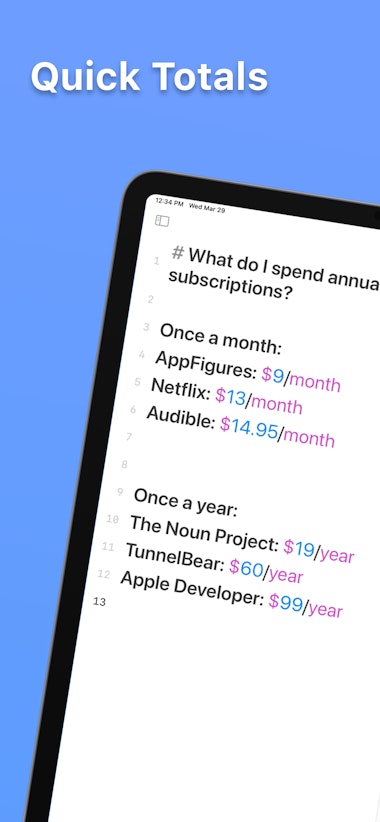 Soulver note-taking app identifies math in your natural language text and performs necessary calculations. With the app, you can total your monthly budget, figure out how many days are left until your next rent payment, find proportions and percentages, and even use variables to avoid repeating the same long number over and over in your text.